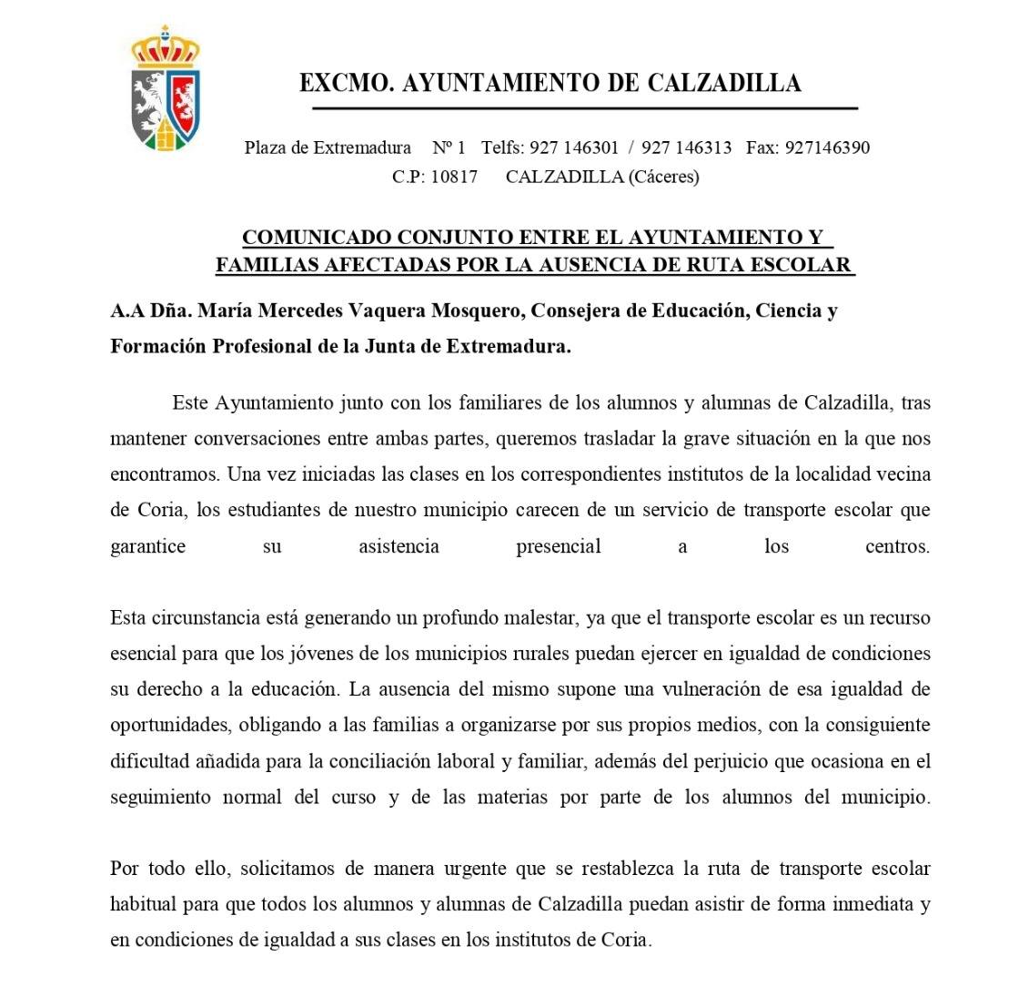 El Ayuntamiento junto a las familias afectadas por la ausencia de ruta de transporte escolar para los alumnos del municipio que cursan sus estudios en Coria, ha mandado el siguiente comunicado a la Consejera de Educación de la Junta de Extremadura, manifestando la preocupación y el malestar de la situación, exigiendo que se solucione la problemática existente