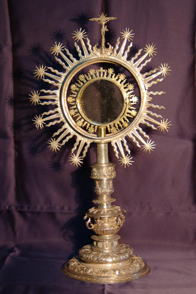 Custodia de sol de plata en su color (53 cms. de altura por 19 cms de diámetro de la base). El pie está maravillosamente repujado y cincelado con motivos manierista: querubines, roleos y guirnaldas.