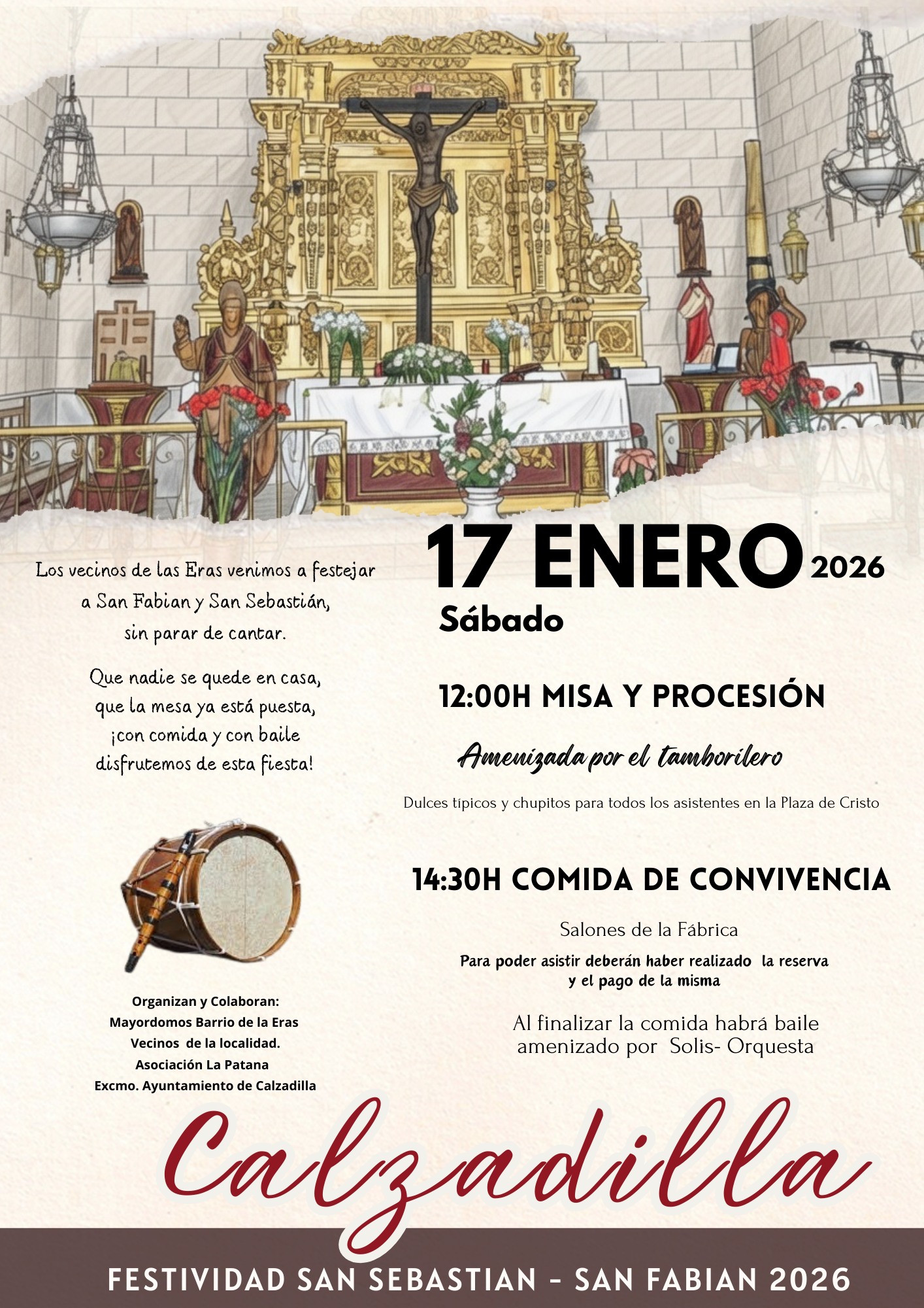 Los mayordomos del barrio de las eras organizan el próximo Sábado 17 de Enero la festividad de San Sebastián y San Fabián. 14 enero 2026 Misa , Procesión y comida de convivencia (previo reserva y pago de las misma)