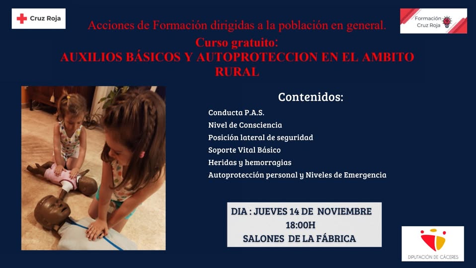 Acciones de Formación dirigidas a la población en general. 07 noviembre 2024 Curso gratuito. Auxilios Básicos y Autoprotección en el ámbito rural.