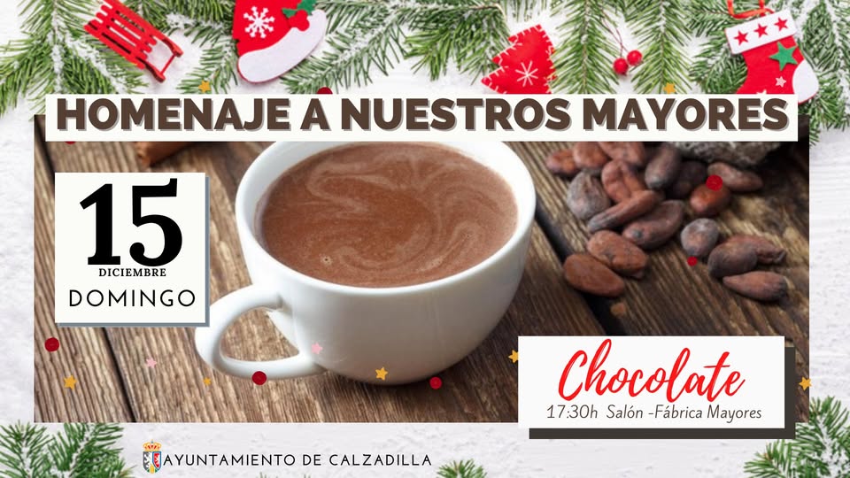 HOMENAJE A NUESTROS MAYORES. 13 diciembre 2024 Domingo 15 Diciembre. 17:30 Salón- Fabrica Mayores El Ayuntamiento invita a todos sus mayores el próximo Domingo 15 de diciembre, a un chocolate con churros en el salón de la asociación de mayores.
